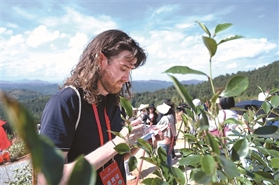 2024“鼓嶺緣”中美青年交流周期間,北京大學燕京學堂研一的美國學生葛逸思在為種植的友誼樹寫上寄語。新華社記者 林善傳攝