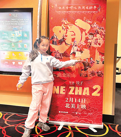 圖為唐夢(mèng)竹的女兒在美國(guó)洛杉磯一家影院的《哪吒之魔童鬧海》宣傳海報(bào)前留影。