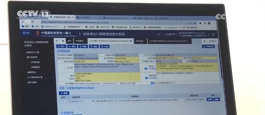 當(dāng)日,廣西桂林一家紡織企業(yè)通過國際貿(mào)易“單一窗口”申報,為一批出口到菲律賓的貨物自主出具了廣西首份RCEP原產(chǎn)地聲明,貨值約9萬元,在菲律賓享受關(guān)稅優(yōu)惠約1.3萬元。2022年,這家紡織企業(yè)作為海關(guān)高級認(rèn)證企業(yè),率先認(rèn)證成為廣西紡織領(lǐng)域首家“經(jīng)核準(zhǔn)出口商”。