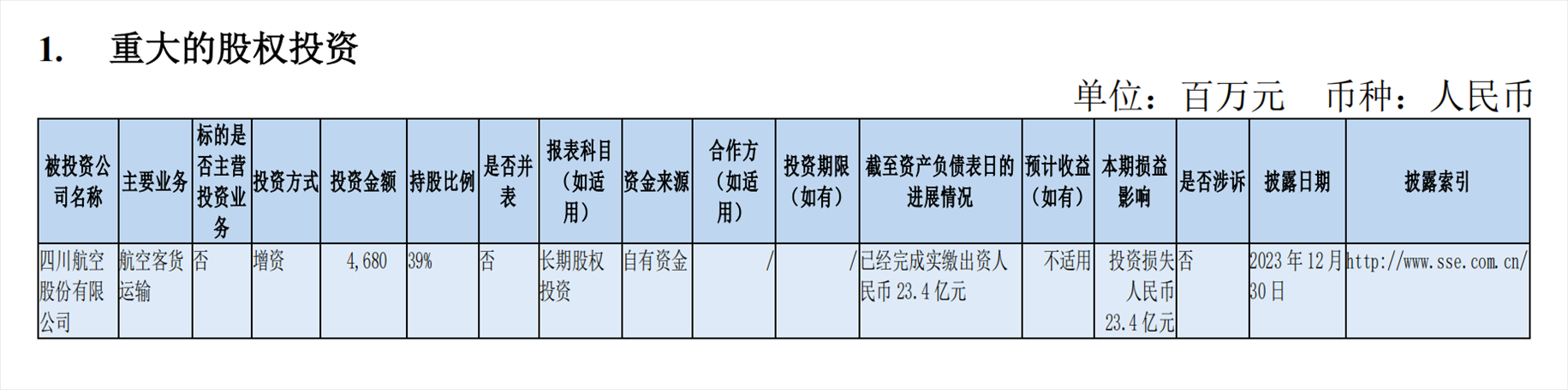 南方航空副董事長、總經(jīng)理韓文勝在3月29日的業(yè)績說明會上也提到,四川航空前期未確認(rèn)的損失自2021年6月開始形成,截至2023年12月31日增資當(dāng)期,確認(rèn)虧損23.4億元,尚未確認(rèn)26.6億元。投資損失產(chǎn)生的原因主要是疫情期間四川航空累計(jì)經(jīng)營虧損,超出南航對四川航空的投資成本。