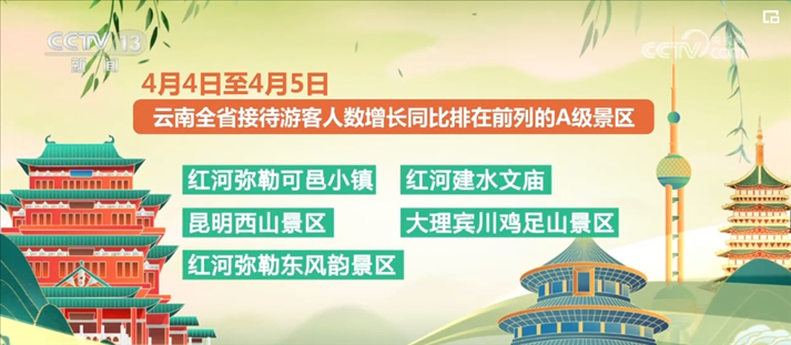 清明假期前兩日,云南全省接待游客數(shù)量排在前列的A級景區(qū)分別是麗江古城、大理古城、官渡古鎮(zhèn)、楚雄的彝人古鎮(zhèn)、西雙版納的告莊西雙景。