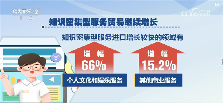 知識(shí)密集型服務(wù)貿(mào)易繼續(xù)增長(zhǎng)。2024年一季度,知識(shí)密集型服務(wù)進(jìn)出口7332.6億元,增長(zhǎng)5.6%。其中知識(shí)密集型服務(wù)出口增長(zhǎng)較快的領(lǐng)域有知識(shí)產(chǎn)權(quán)使用費(fèi)、個(gè)人文化和娛樂(lè)服務(wù),增幅分別為34.4%、19%;知識(shí)密集型服務(wù)進(jìn)口增長(zhǎng)較快的領(lǐng)域有個(gè)人文化和娛樂(lè)服務(wù)、其他商業(yè)服務(wù),增幅分別為66%、15.2%。