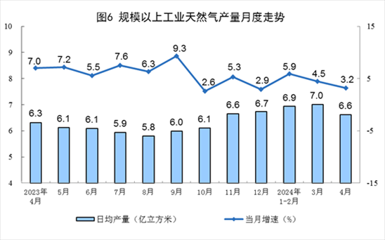 天然氣生產(chǎn)穩(wěn)定增長(zhǎng),進(jìn)口保持較快增長(zhǎng)。4月份,規(guī)上工業(yè)天然氣產(chǎn)量198億立方米,同比增長(zhǎng)3.2%,增速比3月份放緩1.3個(gè)百分點(diǎn);日均產(chǎn)量6.6億立方米。進(jìn)口天然氣1030萬噸,同比增長(zhǎng)15.1%。