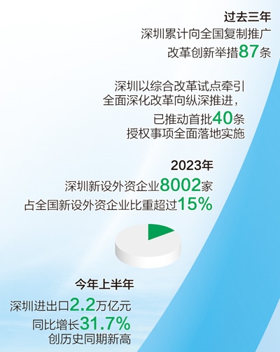 改革開放釋放澎湃動能。深圳發(fā)布支持外商投資生物醫(yī)藥領(lǐng)域、實施跨境貿(mào)易投資高水平開放政策試點(diǎn)等20條措施,出臺優(yōu)化國際化營商環(huán)境工作方案,持續(xù)提升對全球優(yōu)質(zhì)要素資源的強(qiáng)大吸引力。去年全年,深圳新設(shè)外資企業(yè)8002家,占全國新設(shè)外資企業(yè)比重超過15%;今年上半年,深圳進(jìn)出口總額2.2萬億元,同比增長31.7%,創(chuàng)深圳歷史同期新高。
