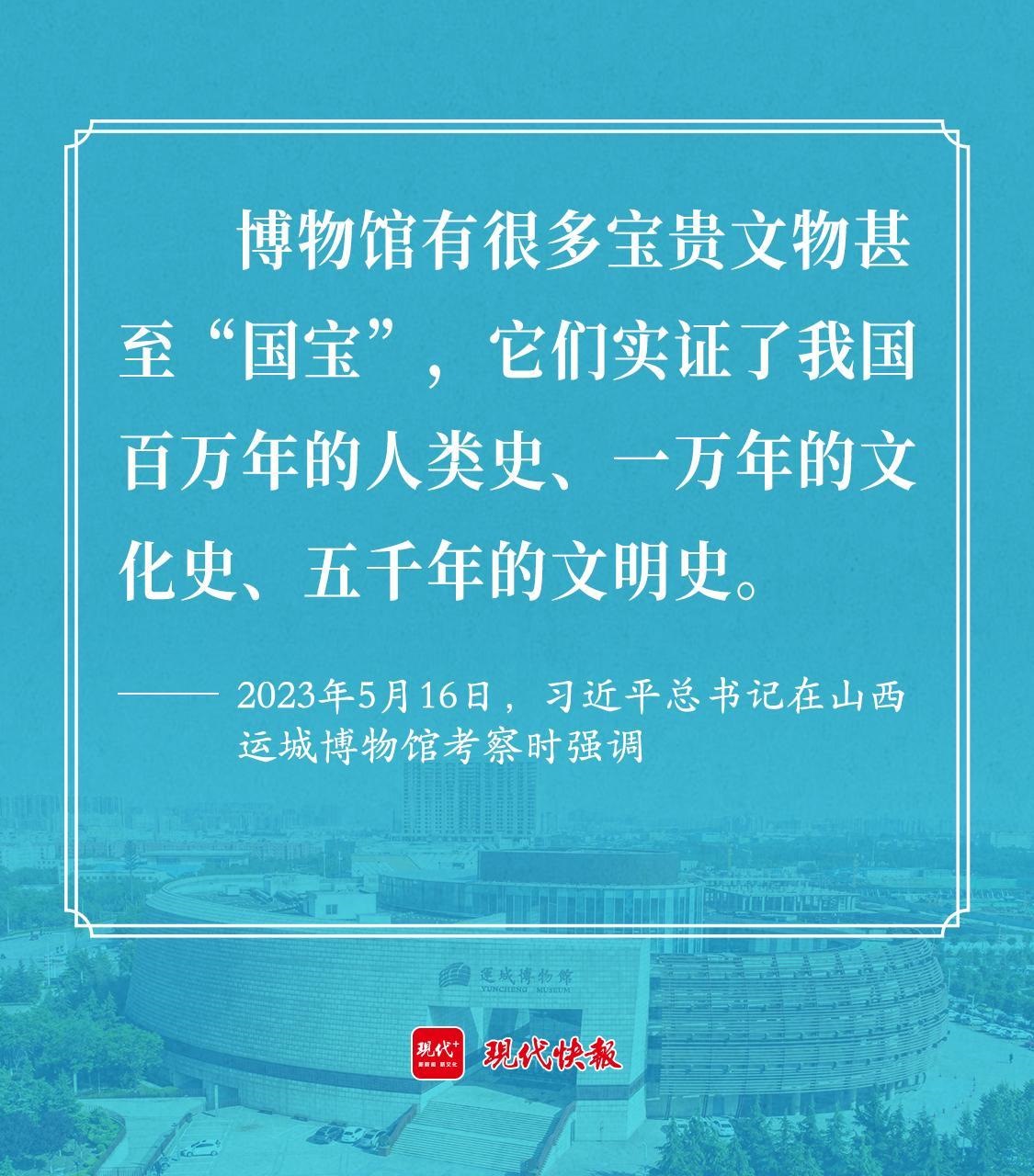 2023年5月16日,習(xí)近平總書記考察山西運(yùn)城博物館時強(qiáng)調(diào),博物館有很多寶貴文物甚至“國寶”,它們實(shí)證了我國百萬年的人類史、一萬年的文化史、五千年的文明史。
