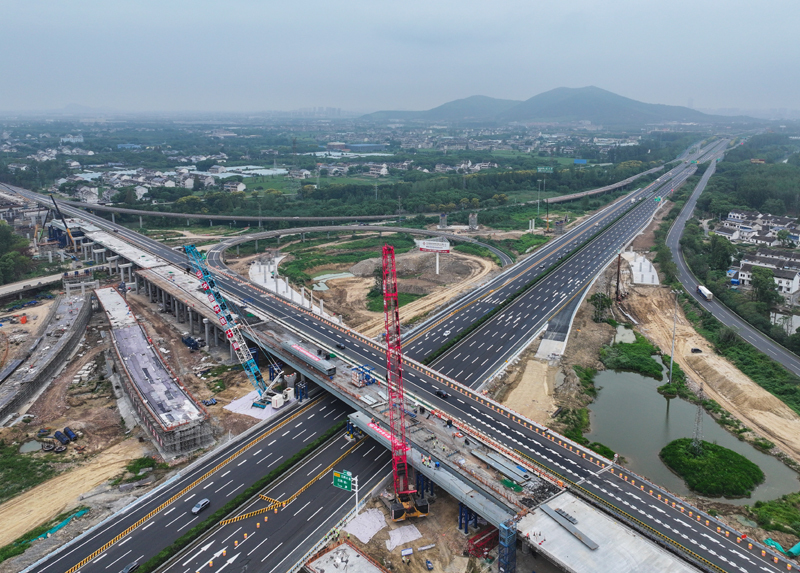 9月13日拍攝的滬武高速公路擴(kuò)建工程江陰段上跨京滬高速公路鋼箱梁架設(shè)施工現(xiàn)場(chǎng)(無(wú)人機(jī)照片)。