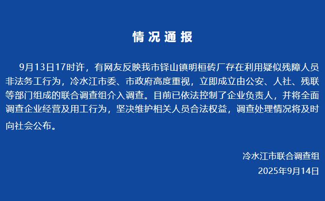 據(jù)“冷水江新聞”微信公眾號消息,9月13日17時許,有網(wǎng)友反映湖南冷水江市鐸山鎮(zhèn)明桓磚廠存在利用疑似殘障人員非法務(wù)工行為,冷水江市委、市政府高度重視,立即成立由公安、人社、殘聯(lián)等部門組成的聯(lián)合調(diào)查組介入調(diào)查。目前已依法控制了企業(yè)負(fù)責(zé)人,并將全面調(diào)查企業(yè)經(jīng)營及用工行為,堅決維護(hù)相關(guān)人員合法權(quán)益,調(diào)查處理情況將及時向社會公布。