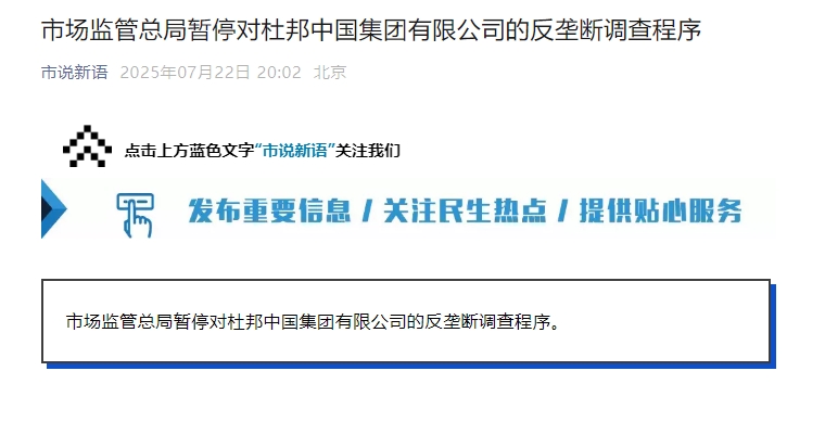 “市說新語”微信公眾號消息,市場監(jiān)管總局暫停對杜邦中國集團有限公司的反壟斷調查程序。