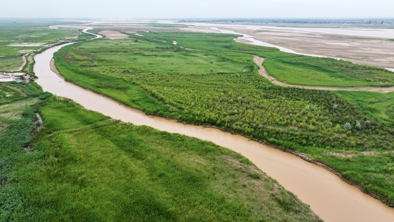 這是2025年6月22日在寧夏平羅縣境內(nèi)拍攝的黃河灘涂濕地(無人機(jī)照片)。新華社記者 王鵬 攝
