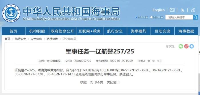 據(jù)中國海事局網(wǎng)站消息,大連海事局發(fā)布航行警告,7月27日16時至8月10日16時,渤海海峽黃海北部部分海域執(zhí)行軍事任務(wù),禁止駛?cè)搿?/p>