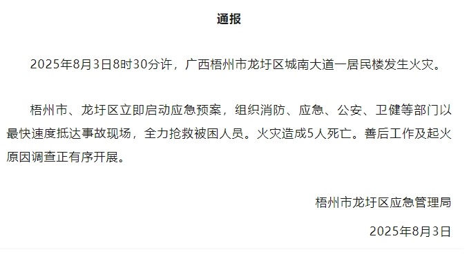 記者從廣西梧州市龍圩區(qū)應(yīng)急管理局了解到,8月3日8時(shí)30分許,梧州市龍圩區(qū)城南大道一居民樓發(fā)生火災(zāi)。梧州市、龍圩區(qū)啟動(dòng)應(yīng)急預(yù)案,組織消防、應(yīng)急、公安、衛(wèi)健等部門抵達(dá)事故現(xiàn)場,搶救被困人員。火災(zāi)造成5人死亡。善后工作及起火原因調(diào)查正有序開展。