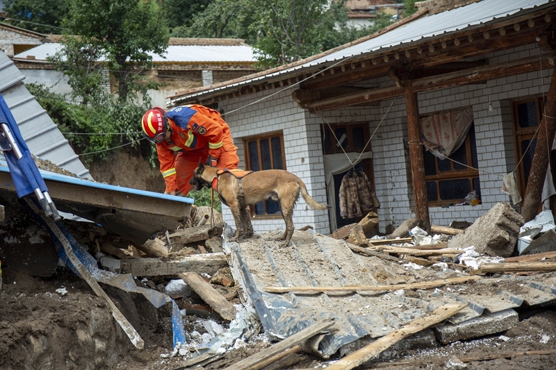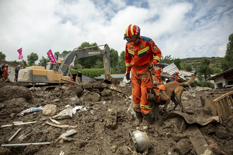 8月9日,國家西北區(qū)域應急救援中心指戰(zhàn)員在馬坡鄉(xiāng)舊莊溝村攜帶搜救犬配合大型機械搜救失聯(lián)人員。