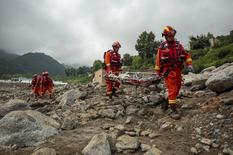 8月9日,國家西北區(qū)域應急救援中心指戰(zhàn)員在馬坡鄉(xiāng)舊莊溝村攜帶救援擔架沿河道搜救失聯(lián)人員。