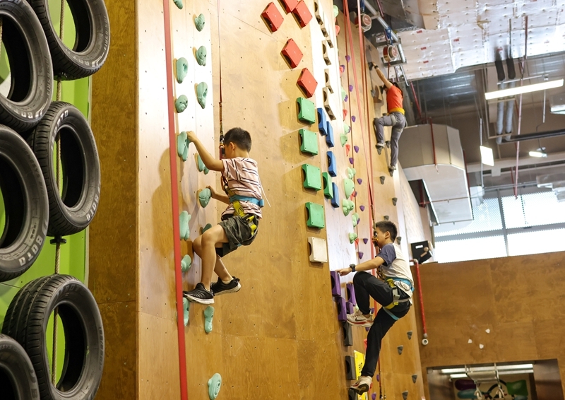 8月10日,小朋友在湖北省武漢市武昌區(qū)一家攀巖館體驗(yàn)攀巖。