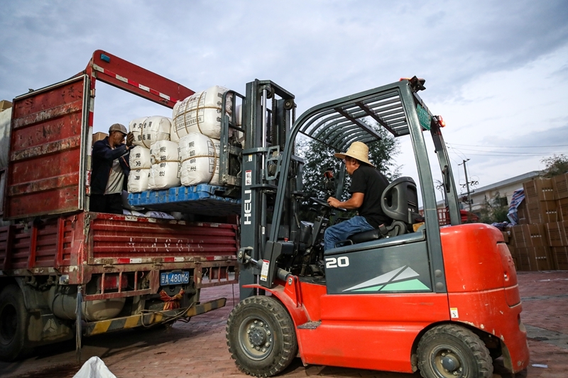 8月10日,在榆中縣救災(zāi)物資儲(chǔ)備服務(wù)中心,工作人員將救災(zāi)物資裝車(chē)。