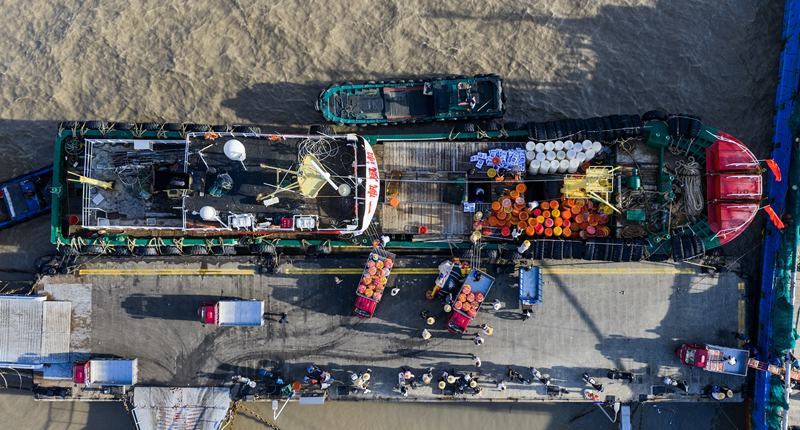 8月12日,開(kāi)漁歸來(lái)的漁運(yùn)船靠泊在舟山沈家門(mén)舟山國(guó)際水產(chǎn)城碼頭,整筐的梭子蟹被運(yùn)送上岸裝車(chē)(無(wú)人機(jī)照片)。