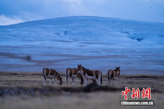 2024年10月23日,中國國家一級保護動物藏野驢在西藏自治區(qū)那曲市安多縣多瑪鄉(xiāng)境內的草原上覓食、嬉戲。中新社記者 貢嘎來松 攝