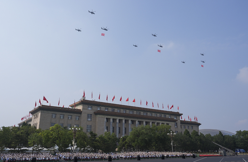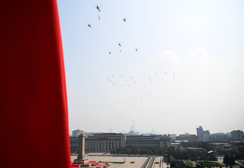 9月3日,紀(jì)念中國人民抗日戰(zhàn)爭暨世界反法西斯戰(zhàn)爭勝利80周年大會在北京隆重舉行。這是空中護(hù)旗梯隊(duì)飛過天安門廣場上空,26架直升機(jī)匯成巨大的“80”字樣。