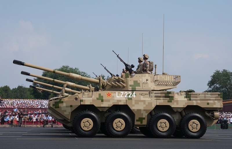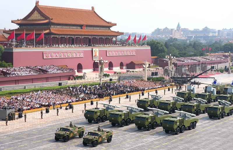 9月3日,紀(jì)念中國人民抗日戰(zhàn)爭暨世界反法西斯戰(zhàn)爭勝利80周年大會(huì)在北京隆重舉行。這是裝備方隊(duì)接受檢閱。