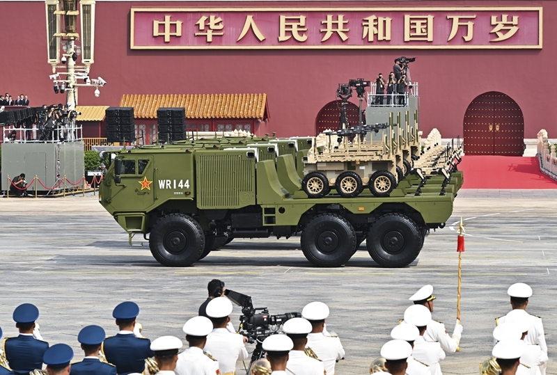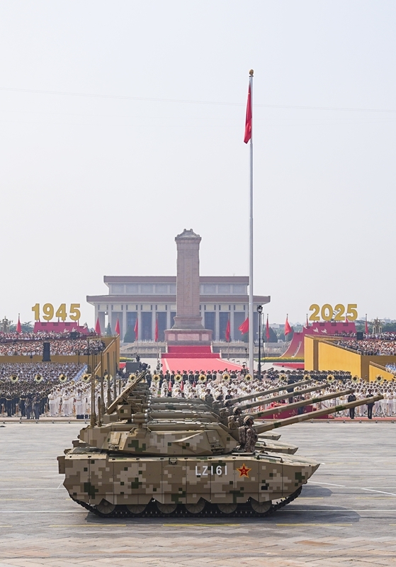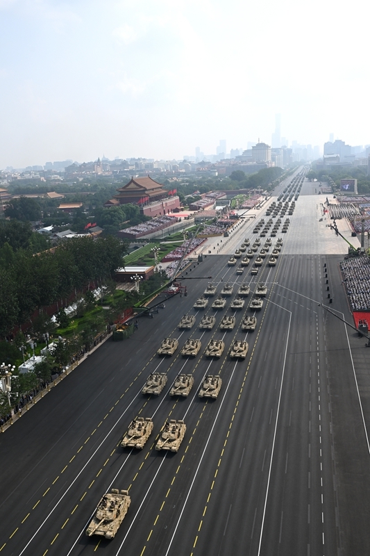 9月3日,紀(jì)念中國人民抗日戰(zhàn)爭暨世界反法西斯戰(zhàn)爭勝利80周年大會(huì)在北京隆重舉行。這是裝備方隊(duì)通過天安門廣場(chǎng)。