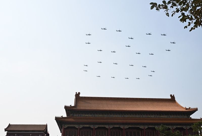 9月3日,紀(jì)念中國人民抗日戰(zhàn)爭暨世界反法西斯戰(zhàn)爭勝利80周年大會(huì)在北京隆重舉行。這是空中護(hù)旗梯隊(duì)接受檢閱。