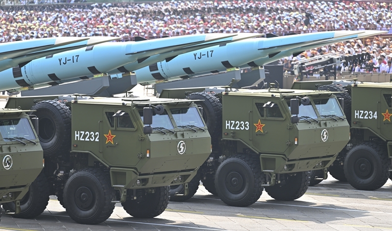 9月3日,紀(jì)念中國人民抗日戰(zhàn)爭暨世界反法西斯戰(zhàn)爭勝利80周年大會(huì)在北京隆重舉行。這是反艦導(dǎo)彈方隊(duì)接受檢閱。