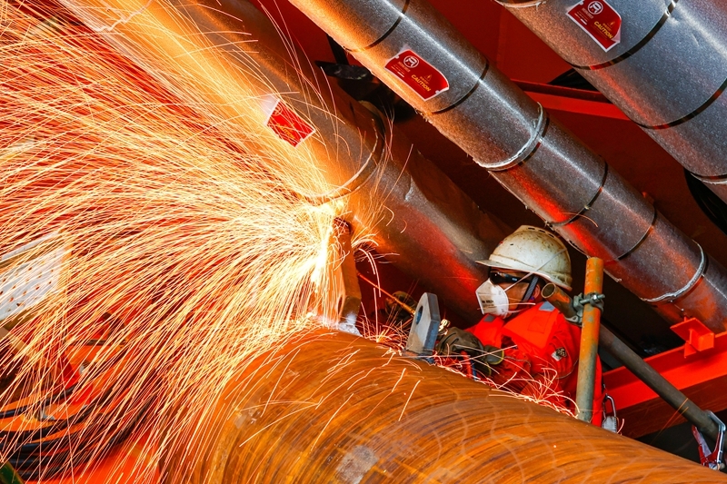 9月8日,工人在墾利6-1油田10-1北區(qū)塊Ⅱ期開(kāi)發(fā)項(xiàng)目油氣平臺(tái)安裝作業(yè)現(xiàn)場(chǎng)進(jìn)行切割作業(yè)。