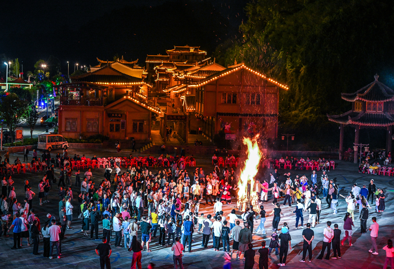 10月5日晚,在貴州省晴隆縣阿妹戚托小鎮(zhèn),游客與當(dāng)?shù)厝罕妵艋鸸参琛?br/>
