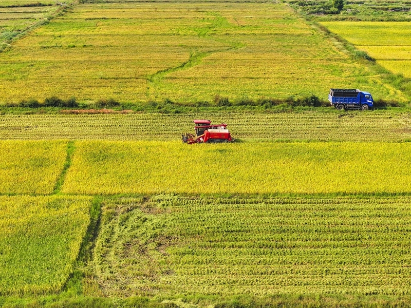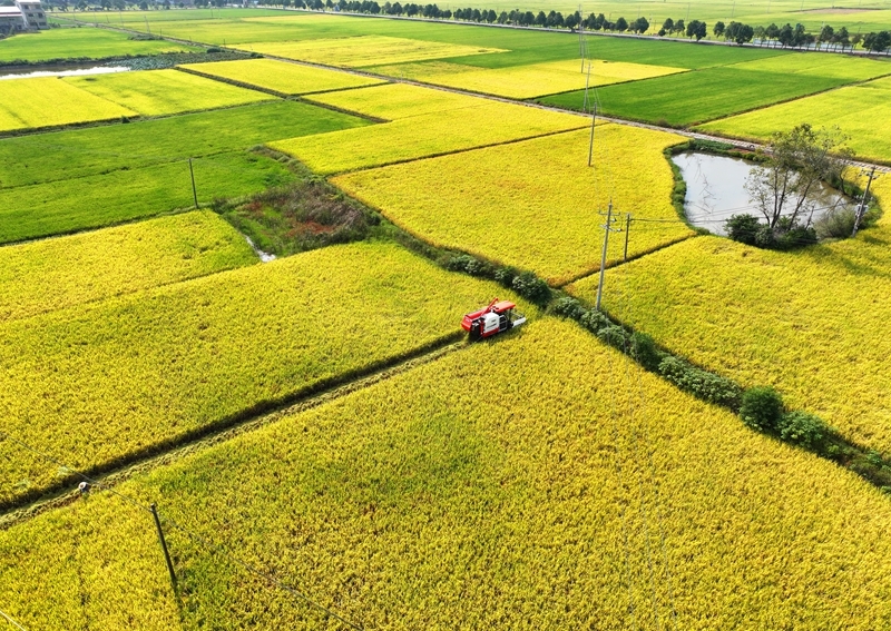 10月11日,湖南省衡陽(yáng)市衡山縣白果鎮(zhèn)村民駕駛農(nóng)機(jī)收割稻谷(無人機(jī)照片)。