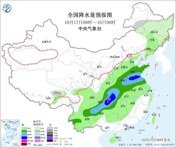 10月17日08時至18日08時,東北地區(qū)中北部、內(nèi)蒙古東北部、西藏東北部等地的部分地區(qū)有小到中雪或雨夾雪;華北南部、黃淮、江淮北部、湖北、重慶、貴州中北部、湖南西北部、云南東北部和西南部等地部分地區(qū)有中到大雨,其中,山東南部、河南東部、安徽北部、江蘇北部、湖北西南部、湖南西北部、重慶東部、貴州東北部等地部分地區(qū)有暴雨或大暴雨(100~110毫米)。內(nèi)蒙古中東部、華北北部和東部、黃淮、江淮等地部分地區(qū)有4~6級風(fēng)。