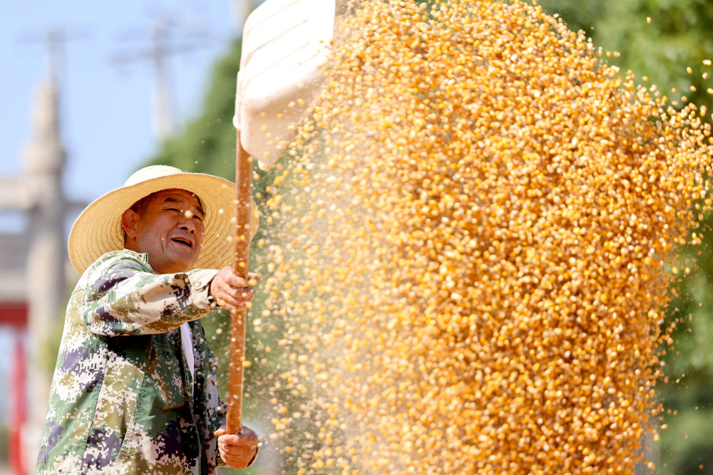 10月16日,山東省棗莊市孟莊鎮(zhèn)劉嶺村農(nóng)民揚(yáng)曬收獲的玉米。新華社發(fā)(孫中喆 攝)