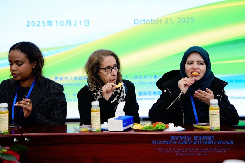 駐華大使夫人品嘗著不同品種的獼猴桃以及各式各樣的獼猴桃深加工食品,紛紛稱贊其細(xì)膩的口感、獨(dú)特的風(fēng)味和濃郁的果香。“這不僅是一次味覺的享受,更是一次對中國鄉(xiāng)村產(chǎn)業(yè)振興的直觀感受?!蹦β甯珩v華大使夫人表示,“我非常期待后續(xù)可以和周至合作,因?yàn)槟β甯绾芟矚g這種水果,我也希望可以在這里學(xué)到一些產(chǎn)業(yè)發(fā)展的知識,并把這些知識帶回我們國家?!?/p>