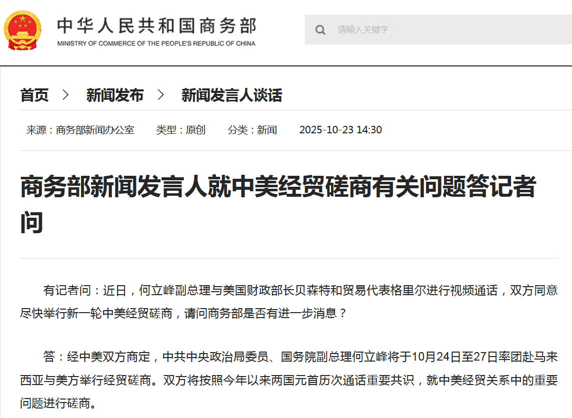 有記者問(wèn):近日,何立峰副總理與美國(guó)財(cái)政部長(zhǎng)貝森特和貿(mào)易代表格里爾進(jìn)行視頻通話(huà),雙方同意盡快舉行新一輪中美經(jīng)貿(mào)磋商,請(qǐng)問(wèn)商務(wù)部是否有進(jìn)一步消息?