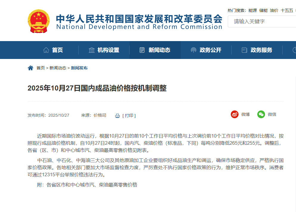 中國(guó)網(wǎng)10月27日訊 據(jù)國(guó)家發(fā)改委網(wǎng)站消息,近期國(guó)際市場(chǎng)油價(jià)波動(dòng)運(yùn)行,根據(jù)10月27日的前10個(gè)工作日平均價(jià)格與上次調(diào)價(jià)前10個(gè)工作日平均價(jià)格對(duì)比情況,按照現(xiàn)行成品油價(jià)格機(jī)制,自10月27日24時(shí)起,國(guó)內(nèi)汽、柴油價(jià)格(標(biāo)準(zhǔn)品,下同)每噸分別降低265元和255元。調(diào)整后,各?。▍^(qū)、市)和中心城市汽、柴油最高零售價(jià)格見附表。