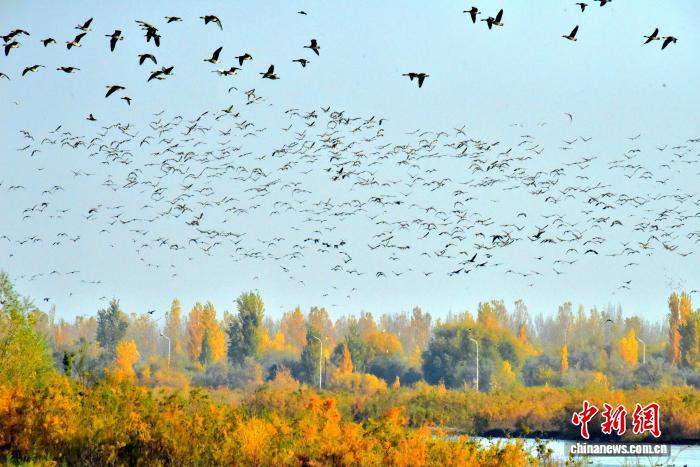 中新網(wǎng)烏魯木齊10月28日電 (黨艷麗)深秋時(shí)節(jié),成群結(jié)隊(duì)的灰雁“到訪”新疆可克達(dá)拉市。它們或飛翔在湛藍(lán)的天空上,發(fā)出陣陣?guó)Q叫聲;或集結(jié)在伊犁河可克達(dá)拉市段河畔,補(bǔ)給“能量”,為接下來(lái)的遷徙旅程做足準(zhǔn)備。