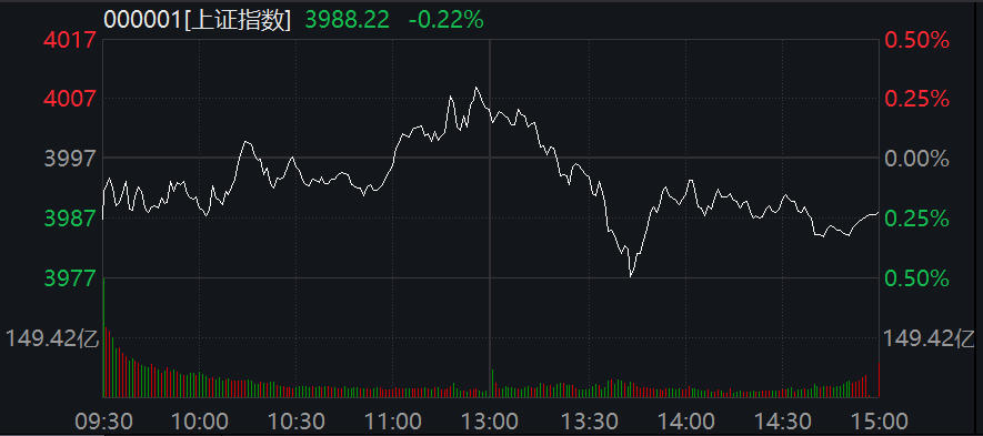 截至收盤,滬指跌0.22%,報(bào)3988.22點(diǎn);深成指跌0.44%,報(bào)13430.1點(diǎn);創(chuàng)業(yè)板指跌0.15%,報(bào)3229.58點(diǎn)。兩市合計(jì)成交21479億元,較上個(gè)交易日縮量約2000億元。