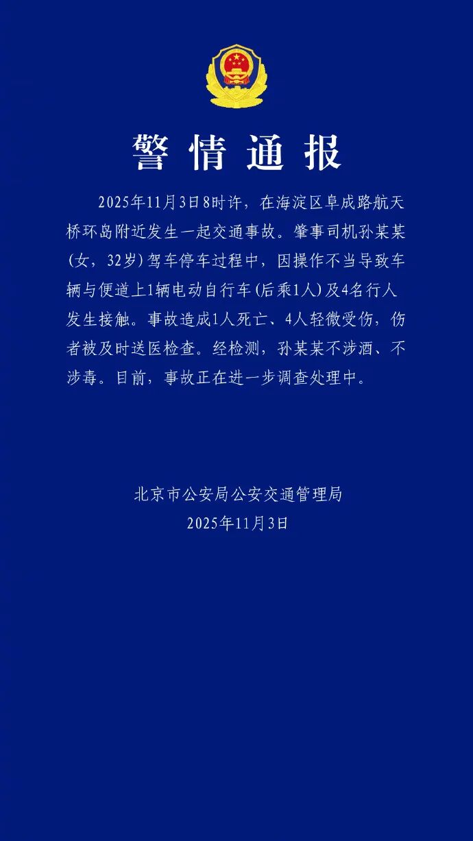 中國(guó)網(wǎng)11月3日訊 11月3日,北京交警發(fā)布通報(bào),當(dāng)日8時(shí)許,在海淀區(qū)阜成路航天橋環(huán)島附近發(fā)生一起交通事故。肇事司機(jī)孫某某(女,32歲)駕車停車過(guò)程中,因操作不當(dāng)導(dǎo)致車輛與便道上1輛電動(dòng)自行車(后乘1人)及4名行人發(fā)生接觸。事故造成1人死亡、4人輕微受傷,傷者被及時(shí)送醫(yī)檢查。經(jīng)檢測(cè),孫某某不涉酒、不涉毒。目前,事故正在進(jìn)一步調(diào)查處理中。