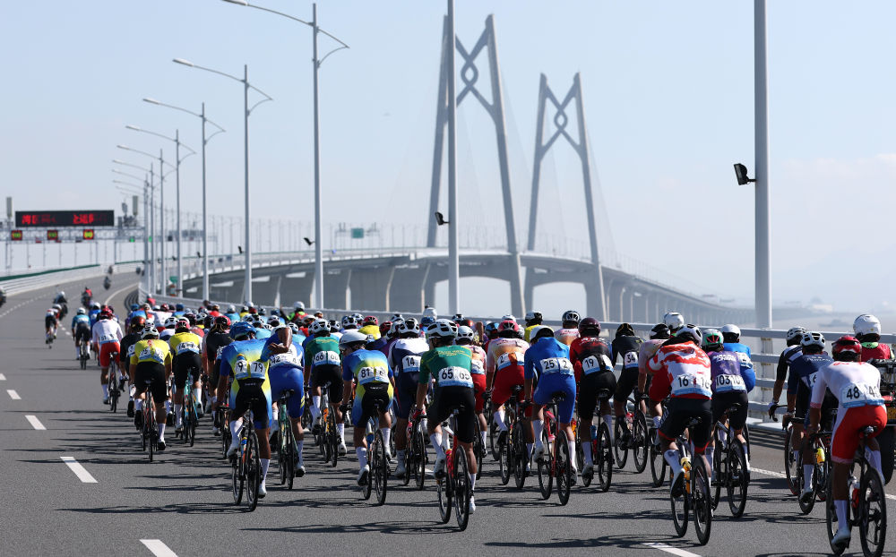 11月8日,參賽選手在港珠澳大橋騎行。當(dāng)日進行的第十五屆全國運動會公路自行車男子個人賽,賽道全程231.8公里,選手經(jīng)過港珠澳大橋,跨越粵港澳三地。這是全運會歷史上首次舉辦跨境比賽。新華社記者 毛思倩 攝