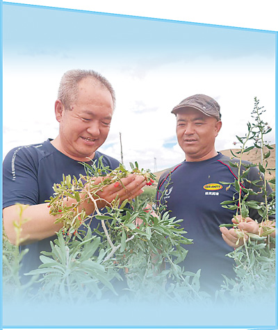 枸杞采摘期,吊堡子村駐村第一書記李宗仁(左)來到枸杞地里查看枸杞產(chǎn)量情況。