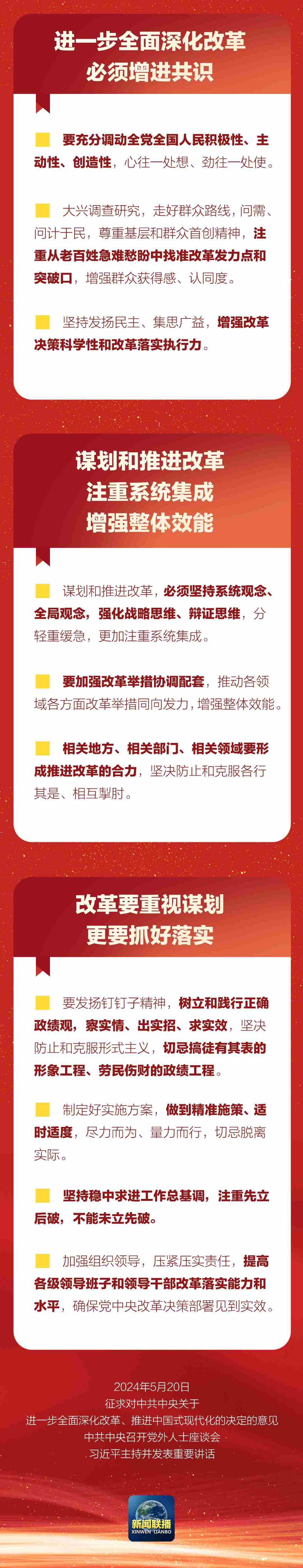 中共中央5月20日在中南海召開黨外人士座談會(huì),就中共中央關(guān)于進(jìn)一步全面深化改革、推進(jìn)中國式現(xiàn)代化的決定聽取各民主黨派中央、全國工商聯(lián)負(fù)責(zé)人和無黨派人士代表的意見建議。中共中央總書記習(xí)近平主持座談會(huì)并發(fā)表重要講話。