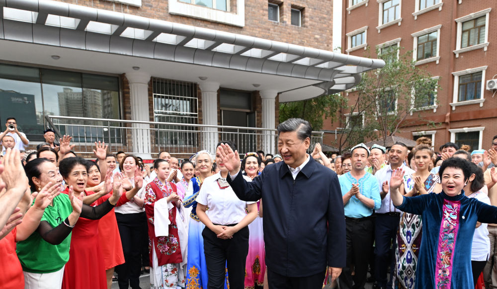 2022年7月13日上午,習(xí)近平在新疆烏魯木齊市天山區(qū)固原巷社區(qū)考察時(shí),身著民族服裝的各族群眾簇?fù)碓诳倳?shū)記身邊,載歌載舞,向總書(shū)記表達(dá)由衷的愛(ài)戴。