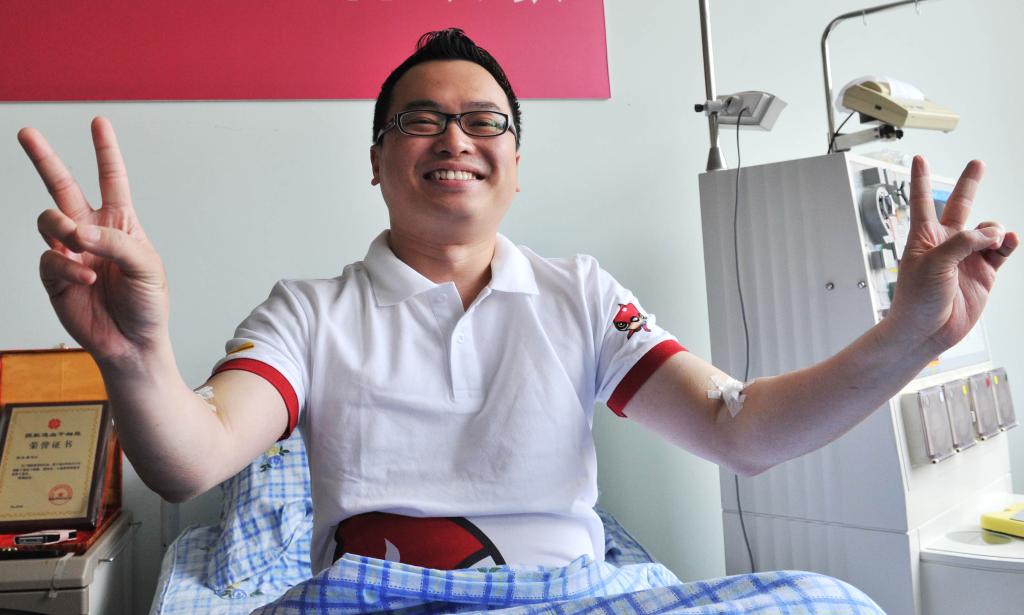2012年4月17日,馬來西亞青年楊永康在造血干細(xì)胞采集結(jié)束后打出勝利的手勢。新華社記者岳月偉攝