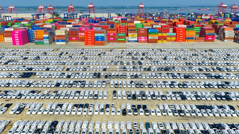 2025年10月4日在江蘇省港口集團南京港龍?zhí)陡蹍^(qū)拍攝的準(zhǔn)備裝船出口的汽車(無人機照片)。新華社發(fā)(楊素平?攝)