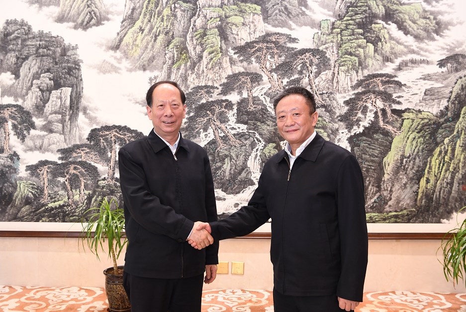 4月30日下午,孫紹騁同志(右)和石泰峰同志親切握手。內(nèi)蒙古日?qǐng)?bào)社融媒體記者 袁永紅攝