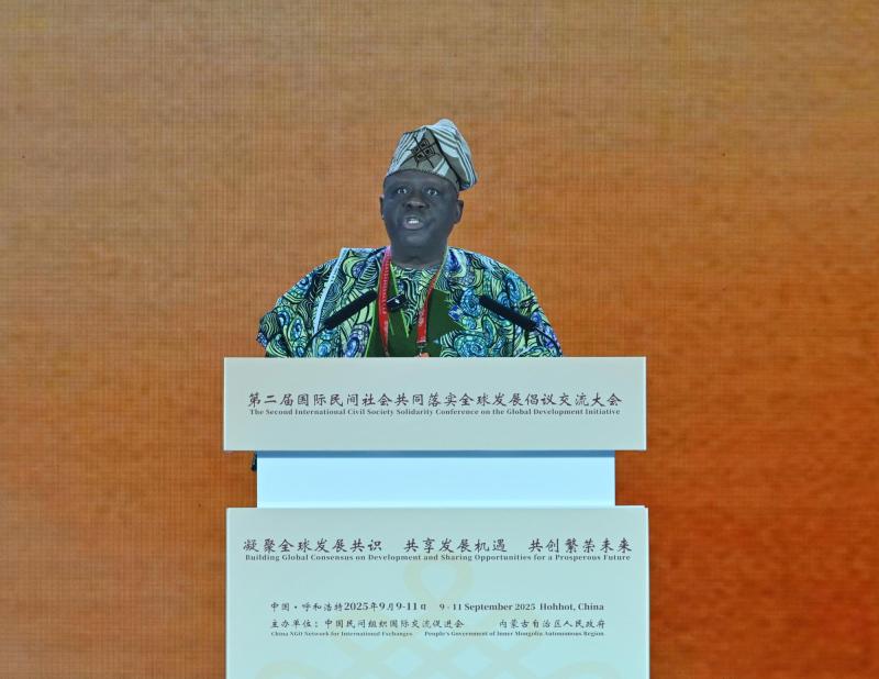 9月10日,貝寧國(guó)民議會(huì)議長(zhǎng)弗拉沃努在第二屆國(guó)際民間社會(huì)共同落實(shí)全球發(fā)展倡議交流大會(huì)開幕式上致辭。草原云·內(nèi)蒙古新聞網(wǎng)記者  馬建兵  攝