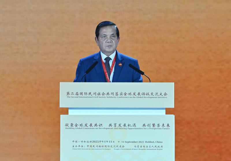 9月10日,柬埔寨參議院第一副主席吳波烈在第二屆國(guó)際民間社會(huì)共同落實(shí)全球發(fā)展倡議交流大會(huì)開幕式上致辭。草原云·內(nèi)蒙古新聞網(wǎng)記者  馬建兵  攝
