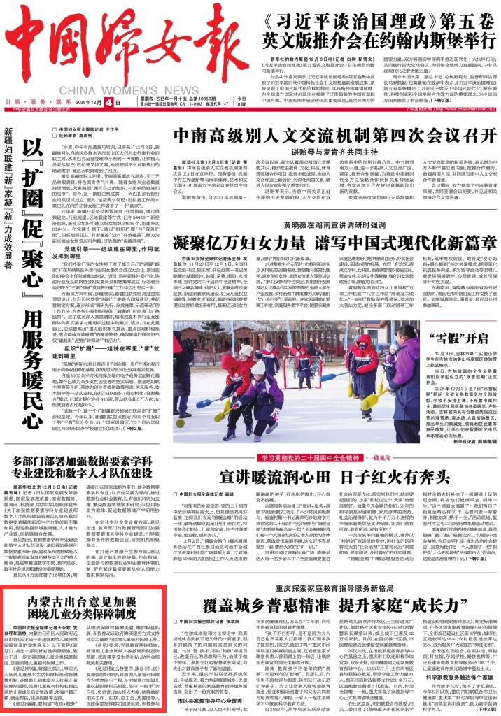 2025年12月4日《中國(guó)婦女報(bào)》第1版刊發(fā)了《內(nèi)蒙古出臺(tái)意見(jiàn)加強(qiáng)困境兒童分類(lèi)保障制度》的文章,報(bào)道了內(nèi)蒙古自治區(qū)人民政府近日出臺(tái)《關(guān)于進(jìn)一步加強(qiáng)困境兒童分類(lèi)保障制度的實(shí)施意見(jiàn)》,提出一系列針對(duì)性保障措施,致力于進(jìn)一步完善困境兒童分類(lèi)保障制度,加強(qiáng)困境兒童福利保障工作。